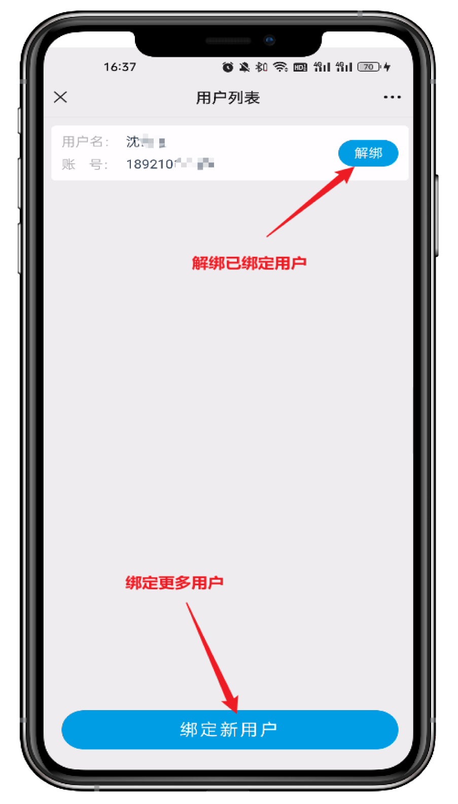 綁定成功后自動(dòng)返回用戶列表 如需解綁,點(diǎn)擊賬號(hào)對(duì)應(yīng)的【解綁】按鈕。 如需綁定更多用戶,點(diǎn)擊下方的【綁定新用戶】 繼續(xù)其他賬號(hào)綁定操作。 |