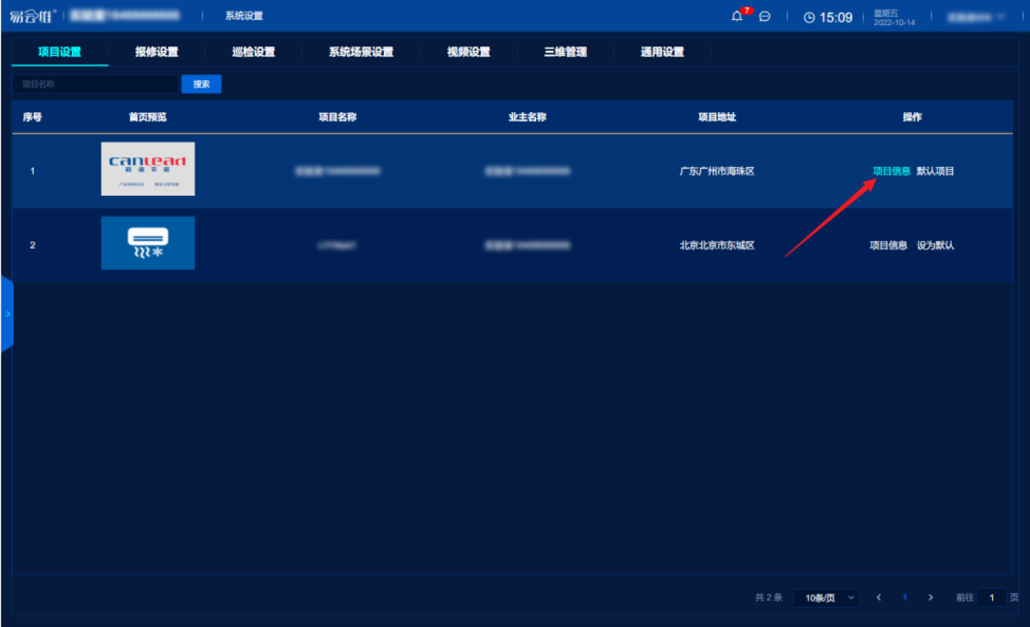登錄電腦業(yè)主端易云維后臺(tái)https://plf.cleos.com.cn 進(jìn)入【系統(tǒng)設(shè)置】-【項(xiàng)目設(shè)置】 點(diǎn)擊【項(xiàng)目信息】,修改項(xiàng)目配置 |