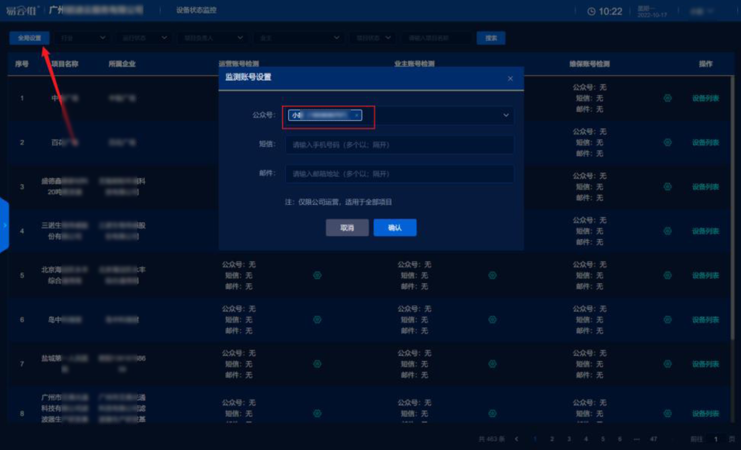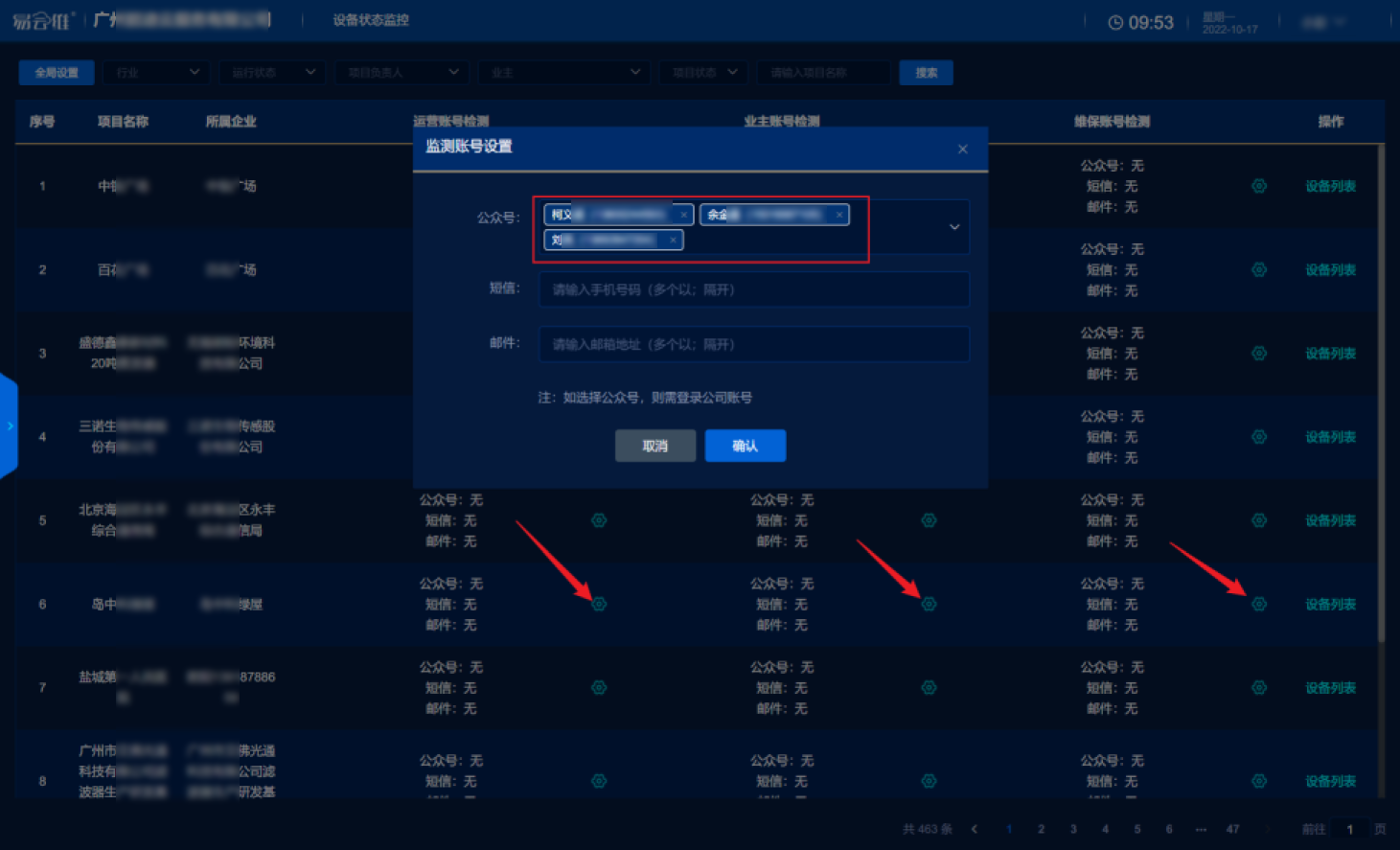 搜索找到具體項(xiàng)目,點(diǎn)擊齒輪按鈕 可分別設(shè)置運(yùn)營(yíng)賬號(hào)、業(yè)主賬號(hào)、維保賬號(hào)進(jìn)行設(shè)備掉線監(jiān)控 監(jiān)控賬號(hào)可多選,點(diǎn)擊【確認(rèn)】完成配置 |